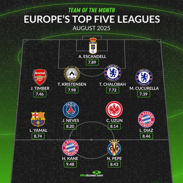 9月2日,五大联赛进入短暂休赛期,whoscored公布了八月份五大联赛评分最佳阵容,拜仁前锋凯恩以9.48分高居榜首。whoscored评选五大联赛8月最佳阵容如下:门将:埃斯坎德尔(皇家奥维耶多,7.89分)后卫:廷伯(阿森纳,7.46分)、克里斯滕森(乌迪内斯,7.18分)、查洛巴(切尔西,7.72分)、库库雷利亚(切尔西,7.39分)中场:亚马尔(巴...